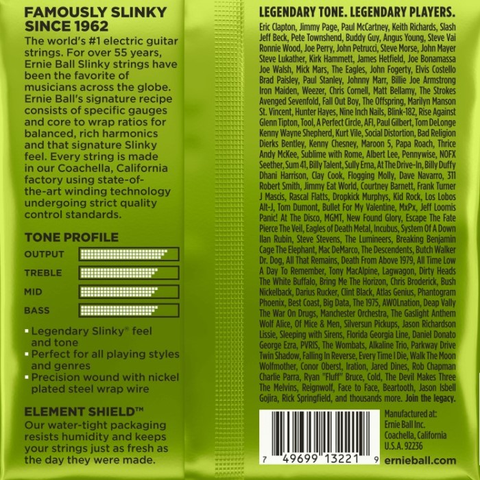 Juego de cuerdas Regular Slinky para guitarra eléctrica de Ernie Ball. Usadas por Eric Clapton, John Mayer, Steve Vai y por legiones de guitarristas en el mundo entero. Es el juego más vendido de Ernie Ball dado que son las cuerdas favoritas de muchos músicos. Fabricadas con un entorchado de alambre de acero niquelado que envuelve el núcleo central hexagonal mientras que las planas se fabrican de acero de alto carbono estañado, especialmente templado para dar un sonido muy equilibrado a tu guitarra.