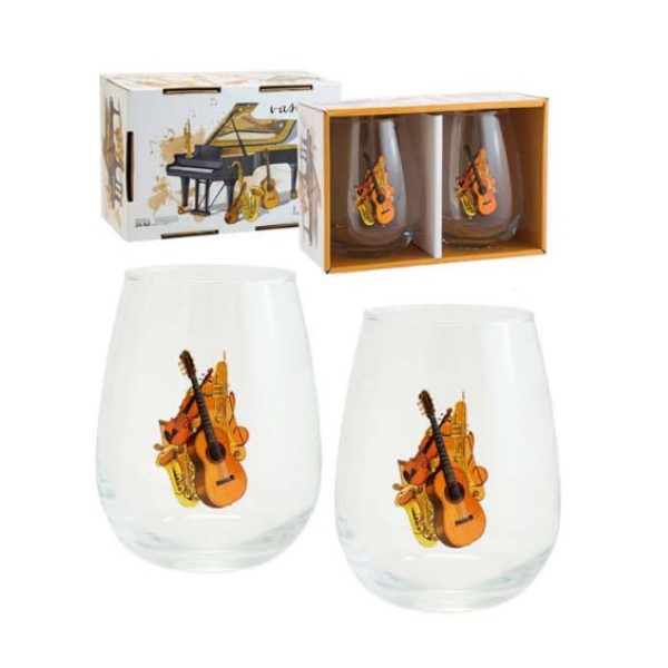 Set de 2 vasos con un decorado de instrumentos musicales, es un buen regalo y una buena forma para darle un tono más musical a tu hogar.