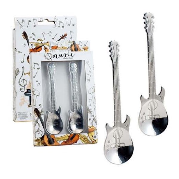 Pack de 2 cucharas con un diseño muy curioso de guitarra, fabricado con acero, es un buen regalo y una buena forma para darle un tono más musical a tu hogar.