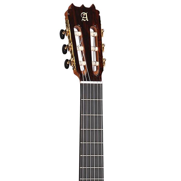 Una flamenca negra, completamente maciza y con tapa de cedro. Una guitarra muy bella y de gran calidad. -Este modelo ha sido desarrollado en colaboración con el guitarrista flamenco Carlos Piñana, donde se han introducido unas especificaciones técnicas que definen un instrumento con las cualidades requeridas por los guitarristas flamencos de hoy en día, consiguiendo una guitarra flamenca muy bella y de gran calidad. -Como elemento diferenciador de la 10 Fp Piñana, salta a la vista el diseño de la pala. Una sirueta en la parte superior moldeada con forma de “cuernos”, con un acabado en brillo, que identifican fácilmente este instrumento y que le aporta mucha personalidad. -El modelo 10 Fp Piñana es una guitarra de las denominadas como negra, marcada por su característica principal, la utilización de Palosanto de India macizo para elaborar los aros y fondo. Aunque cabe destacar la elección del cedro macizo para la tapa. -Una característica poco frecuente en las guitarras flamencas, pero que después de un proceso de desarrollo, mediante una configuración especial de barras armónicas, se consigue un sonido más redondo, se podría decir que más delicado, aunque siempre sin perder el carácter flamenco. -Además en el caso de la 10 Fp Piñana el acabado es en mate, un acabado que requiere de menor cantidad de barniz y mediante el cual se consigue un sonido más potente. -Una guitarra con un sonido muy flamenco pero con una calidez especial, un sonido adecuado para poder interpretar la música flamenca actual, pero sin perder la tradición de este arte. -El modelo 10 Fp Piñana se construye con clavijeros de lujo dorados y un mástil muy cómodo con refuerzo de ébano. -Un instrumento que por sus características estéticas aporta mucha elegancia y personalidad. Cualidades que se potencian cuando se unen al sonido de esta interesante guitarra.