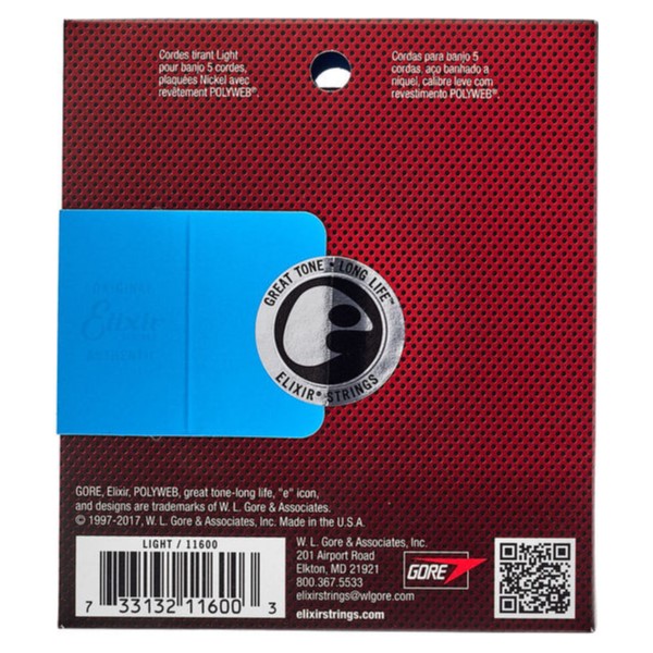 Cuerdas Elixir para Banjo, ligeras y con calibre del .09 al .020 (.009 - .010 - .013 - .020 - .009). Cuerdas para obtener el mejor sonido posible en su Banjo, con tacto suave y articulado, para la comodidad y ligereza del músico. Estas cuerdas tienen un recubrimiento de Polyweb, que es una capa protectora que evita que el polvo, la suciedad y el sudor degraden las cuerdas. Estas cuerdas conservan su tono y tienen una larga durabilidad.