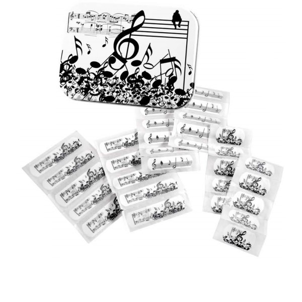 30 tiritas con temática musical, igual que la lata con las que vienen guardadas, hay 3 tipos de tamaño. Es un buen regalo y una buena forma para darle un tono más musical a tus heridas.