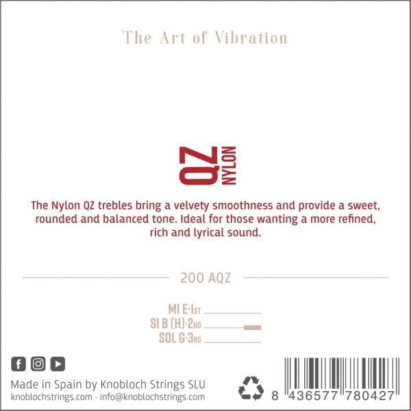 Cuerdas de guitarra clásica/flamenca Knobloch Actives 200AQZ Nylon QZ. Tensión baja. -Juego de primas (1a, 2a y 3a) para guitarra clásica/flamenca Knobloch Actives 200AQZ Nylon QZ fabricadas en nylon. -Los agudos de Nylon QZ ofrecen un sonido más refinado y limpio. Esta nueva generación de nylon premium tiene un diámetro ligeramente más delgado que el nylon tradicional y produce un sonido cálido y dulce. Que el diametro sea más delgado no compromete el volumen para nada y además ofrece un tono muy rico. Su tacto es suave, su afinación perfecta y su equilibrio extraordinario. El nylon QZ se diseñó para aquellos que buscan un sonido más dulce, elegante y limpio. -Si quieres que tu guitarra saque todo su potencial las cuerdas Knobloch son las adecuadas.