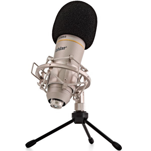 El Ashton um88 USB. Este micrófono de condensador es perfecto para grabar voces directamente en tu ordenador para música, VoIP, podcasting y game-streaming. Incluye un soporte para trípode de sobremesa, un montaje de choque, filtro anti pop, una cartuchera para guardar los utensilios para cuando sea necesario. MICRÓFONO DE CONDENSADOR USB. El UM88 es un micrófono de condensador asequible con una conexión USB integrada de alta calidad. La conectividad USB elimina la necesidad de interfaces de audio y cables tediosos, lo que le permite conectar el micrófono directamente a la ordenador. Esto hace que el micrófono portátil, lo que le permite llevarlo con usted dondequiera que vaya y obtener configuración en minutos. El diseño versátil es ideal para una gama de aplicaciones de podcasting y de videos de Youtube, grabar demos vocales e instrumentos incluso. REPRODUCCIÓN DE SONIDO FE ALTA CALIDAD. En el corazón de la UM88 de Ashton es un premium-cápsula de condensador del grado, proporcionando una amplia respuesta de frecuencia. El amplio rango de frecuencias permite capturar el audio de la fuente con extreme detalle. El resultado es la reproducción de sonido de alta calidad, con un natural tonalidad. El micrófono viene con un montaje de choque diseñado para eliminar el ruido de fondo y manejo para mejorar rendimiento del audio. Además, el micrófono también incluye un soporte en trípode de mesa para uso de escritorio.