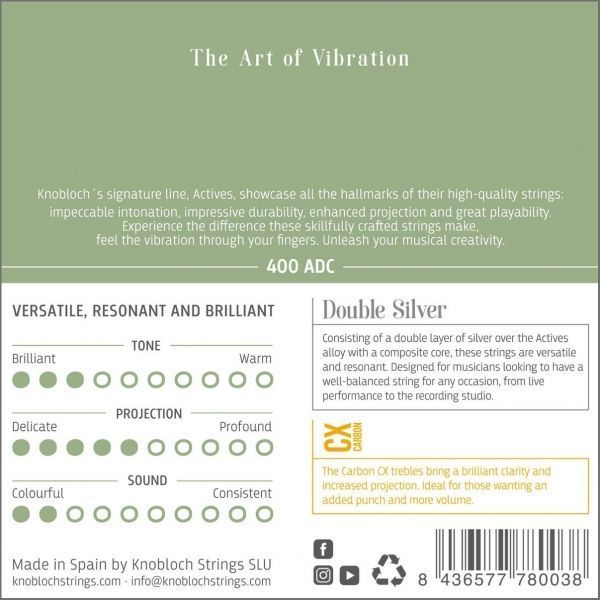 Cuerdas de guitarra clásica/flamenca Knobloch Actives 400ADC. Tensión media-alta. -Este juego de cuerdas para guitarra clásica/flamenca Knobloch Actives 400ADC se compone de bordones entorchados Double Silver con nucleo de nylon-carbono para dotar a la cuerda de mayor resistencia y de primas CX de nylon-carbono. -Los bajos Double Silver de Knobloch son actualmente las cuerdas mas demandadas por guitarristas, su sonido es espectacular con un tono muy rico y mucha potencia, además su resistencia es superior a todas las cuerdas actuales. -Los agudos de Carbon CX son ideales para aquellos guitarristas que quieran agregar un plus de volumen a su interpretación. Aportan brillo y claridad al sonido y aumentan su proyección. Hecho de un material de alta densidad, el carbono CX tiene el diámetro más delgado de la gama de agudos de Knobloch -Una característica que nos encanta de las cuerdas Knobloch y que dice mucho de su calidad es la rapidez con la que las cuerdas alcanzan la estabilidad en la afinación.