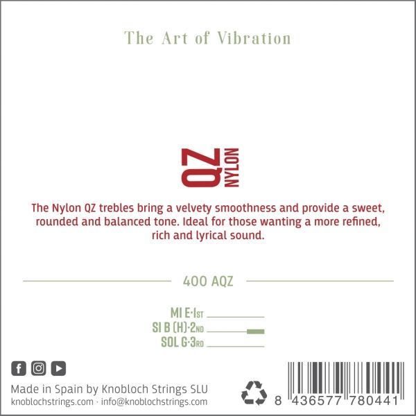 Cuerdas de guitarra clásica/flamenca Knobloch Actives 400AQZ Nylon QZ. Tensión media-alta. -Juego de primas (1a, 2a y 3a) para guitarra clásica/flamenca Knobloch Actives 400AQZ Nylon QZ fabricadas en nylon. -Los agudos de Nylon QZ ofrecen un sonido más refinado y limpio. Esta nueva generación de nylon premium tiene un diámetro ligeramente más delgado que el nylon tradicional y produce un sonido cálido y dulce. Que el diametro sea más delgado no compromete el volumen para nada y además ofrece un tono muy rico. Su tacto es suave, su afinación perfecta y su equilibrio extraordinario. El nylon QZ se diseñó para aquellos que buscan un sonido más dulce, elegante y limpio.
