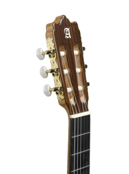 La guitarra 4 P es el modelo más vendido de Guitarras Alhambra. Un instrumento que ha creado tendencia y multitud de seguidores a lo largo de todo el mundo. -Es el primer modelo de la gama en incorporar la madera de Palosanto, un hermoso Palosanto de india utilizado para los aros y fondo. -En lo que respecta a la tapa, en la guitarra clásica modelo 4 P se aplica un acabado con cuatro capas de barniz realzando la madera maciza que la conforma, tanto en la opción de cedro rojo, como en la de Abeto Alemán. -Un acabado que configura un instrumento bello, con interesantes prestaciones y que ofrece muy buenas sensaciones. -El diapasón del modelo 4 P se monta con madera de ébano. Una madera muy dura que resiste la actividad continua de la mano izquierda. -Además, en este modelo se aprecia que los clavijeros son de calidad superior, lo que permiten un ajuste preciso para la adecuada actividad interpretativa. -Un sonido dulce y potente, donde los “huesos”, tanto en selleta como en cejuela, están realizados con melamina. -Un material altamente transmisor del sonido. Un instrumento equilibrado. -En resumen, la guitarra clásica Alhambra 4 P es un instrumento que se engloba en la “Línea Conservatorio”. Un modelo que podemos describir como muy equilibrado, con unas prestaciones muy interesantes y que está a la altura de la fama que ha ido adquiriendo por todo el mundo durante los últimos años.