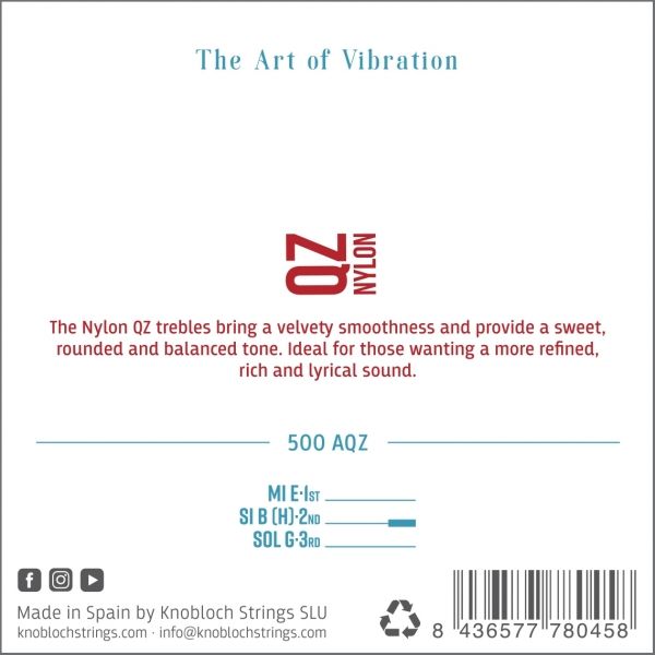 Cuerdas de guitarra clásica/flamenca Knobloch Actives 500AQZ Nylon QZ. Tensión alta. -Juego de primas (1a, 2a y 3a) para guitarra clásica/flamenca Knobloch Actives 500AQZ Nylon QZ fabricadas en nylon. -Los agudos de Nylon QZ ofrecen un sonido más refinado y limpio. Esta nueva generación de nylon premium tiene un diámetro ligeramente más delgado que el nylon tradicional y produce un sonido cálido y dulce. Que el diametro sea más delgado no compromete el volumen para nada y además ofrece un tono muy rico. Su tacto es suave, su afinación perfecta y su equilibrio extraordinario. El nylon QZ se diseñó para aquellos que buscan un sonido más dulce, elegante y limpio.