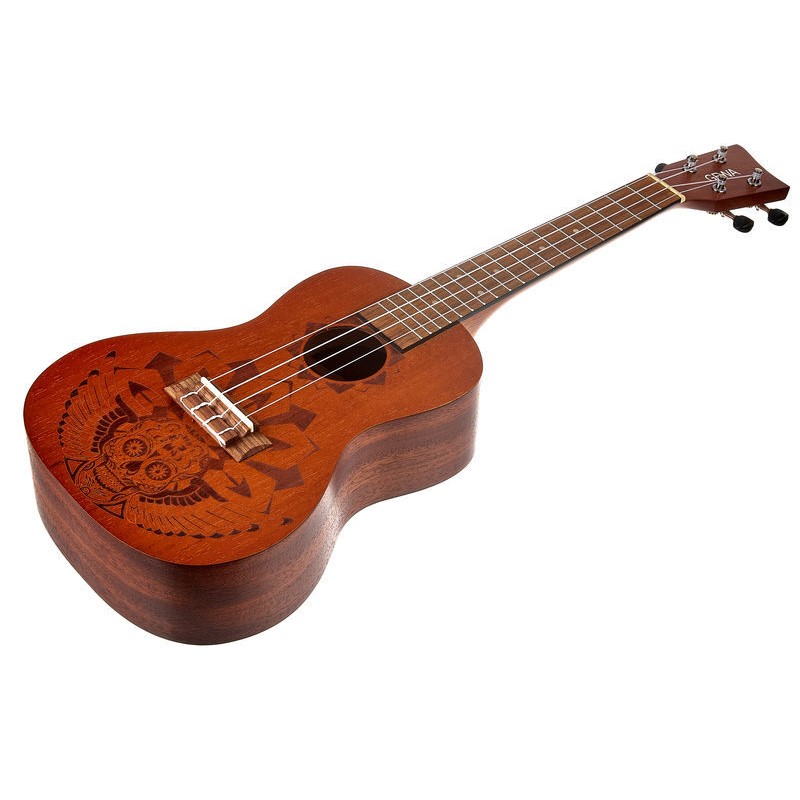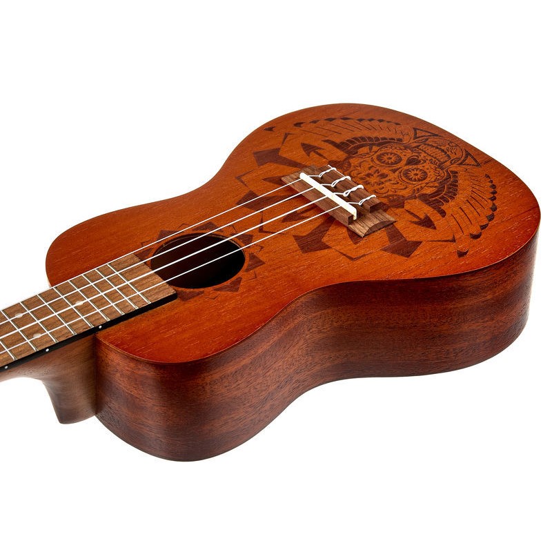 Ukelele concierto fabricado en madera de sapeli ,acabado natural mate, de poro abierto, con un diseño en su tapa de motivos mejicanos hecho en laser para su mayor durabilidad, precioso instrumento con el que podrá deleitar a sus amigos y familiares,ofrece un sonido más completo y profundo que el soprano. Su mayor tamaño lo hace manejable para los principiantes, así como la ejecución de conciertos para una mayor proyección. Incluye funda con motivo de Méjco