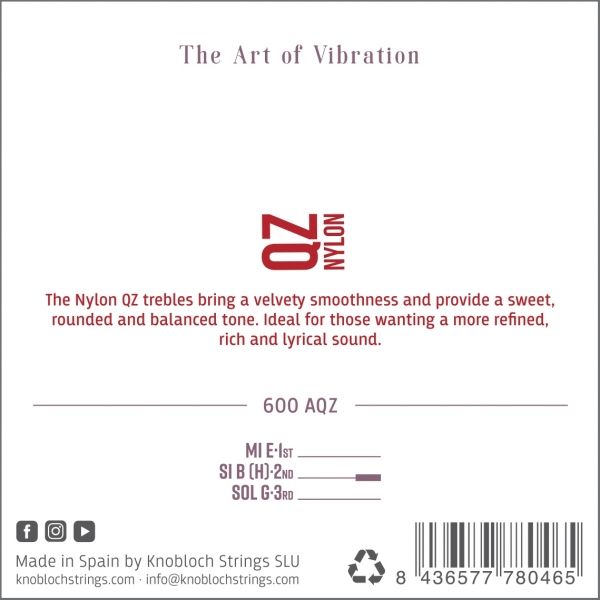Cuerdas de guitarra clásica/flamenca Knobloch Actives 600AQZ Nylon QZ. Tensión super alta. -Juego de primas (1a, 2a y 3a) para guitarra clásica/flamenca Knobloch Actives 600AQZ Nylon QZ fabricadas en nylon. -Los agudos de Nylon QZ ofrecen un sonido más refinado y limpio. Esta nueva generación de nylon premium tiene un diámetro ligeramente más delgado que el nylon tradicional y produce un sonido cálido y dulce. Que el diametro sea más delgado no compromete el volumen para nada y además ofrece un tono muy rico. Su tacto es suave, su afinación perfecta y su equilibrio extraordinario. El nylon QZ se diseñó para aquellos que buscan un sonido más dulce, elegante y limpio.