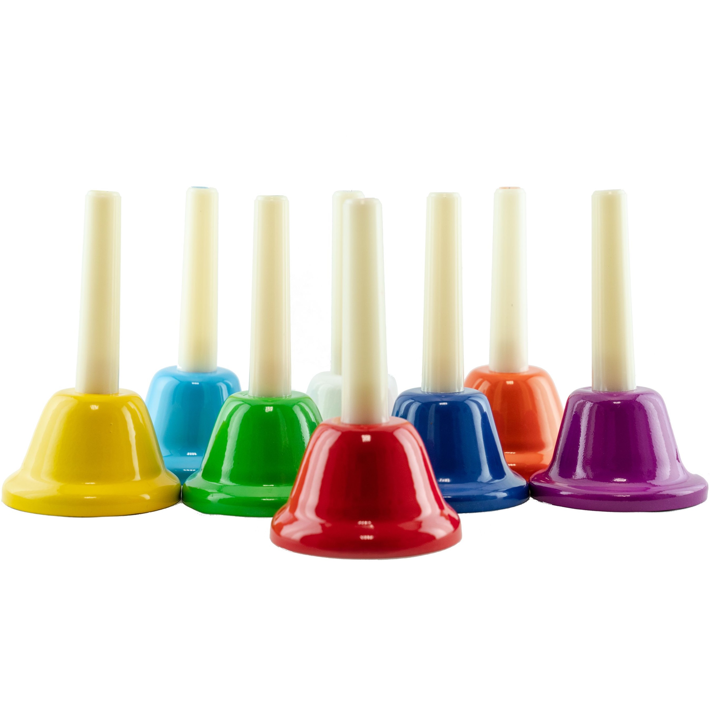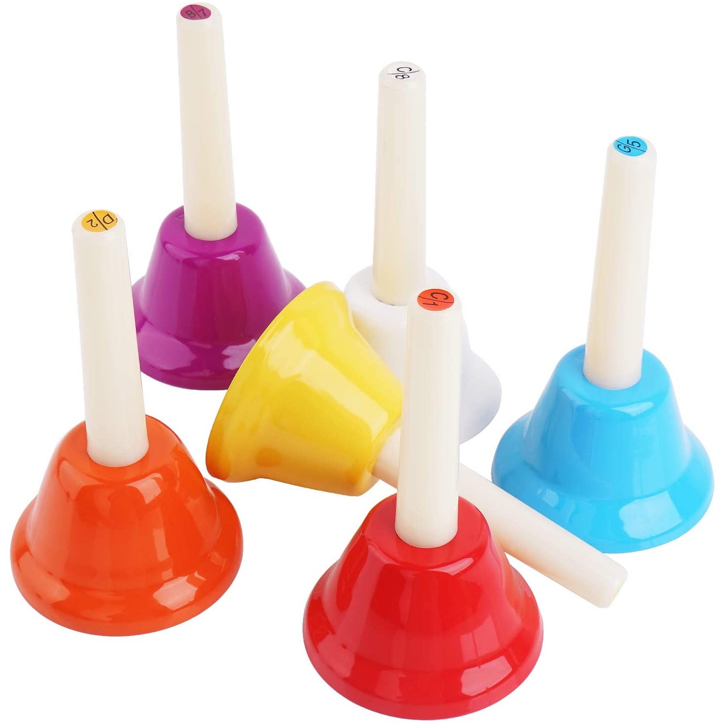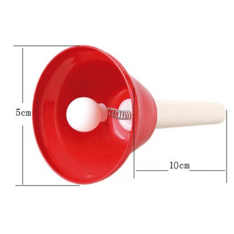 Juego de 8 minicampanas tonales con mango de Samba. Distingidas por colores y notas marcadas en el extremo del mango, sus tonos son C, D, E, F, G, A, B, Hard C sincronizadas correctamente, lo cual es perfecto para que un principiante de música o niños reconozcan los sonidos y tonos. Se pueden hacer muchas actividades educativas la cual los niños puden aprender ritmo, melodia y reconocimiento de notas, una manera muy facil de cultivar la musica en los mas chicos, de una forma fácil y divertida para ellos.