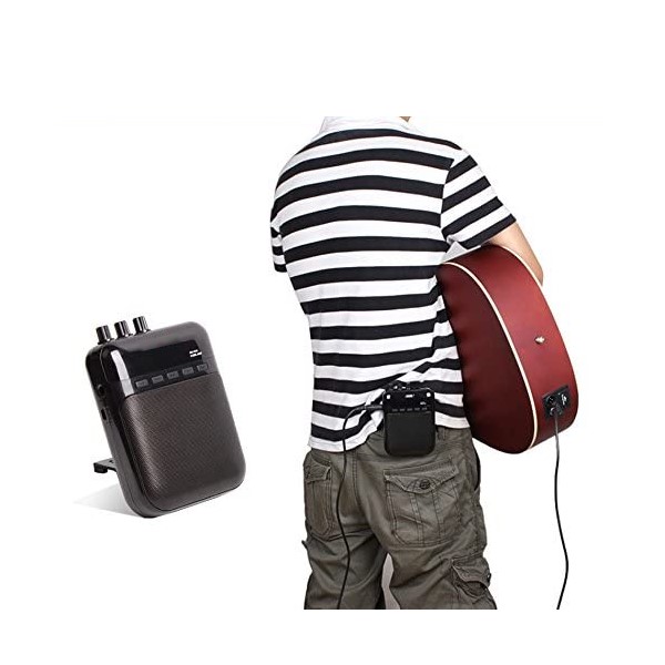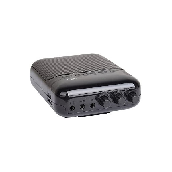 Mini amplificador recargable con micro AG03MIC de EK, mini amplificador de 5W, con batería recargable por USB y con los canales Clean/Distorsión, con los que podras conectar un micro y un auxiliar, con la capacidad de poder grabar y reproducir en tarjjeta micro SD (hasta 32G). Bastante cómodo de llevar ya que es pequeño y tiene un peso muy ligero. INCLUYE MICRÓFONO DE DIDEMA PARA LA CABEZA
