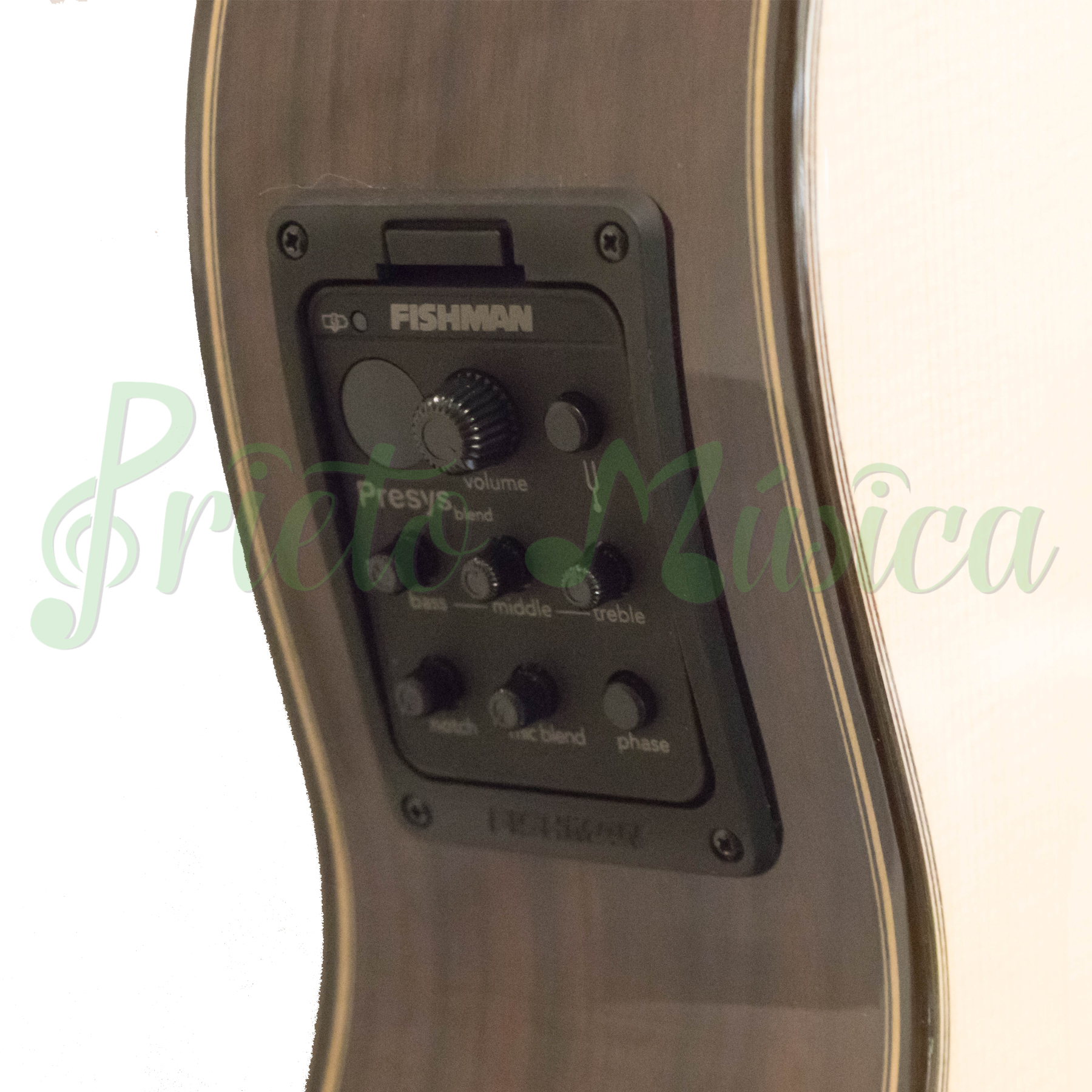 Este modelo viene con la instalación hecha de un previo Fishman Presys blend Este sistema compacto y sofisticado te brinda un control completo sobre tu sonido. Cuenta con controles de volumen, ecualización a tres bandas, interrupotor de fase, interruptor de notch y potenciómetro para la mezcla del micrófono. Además, incluye un práctico afinador sintonizador con pantalla LED.