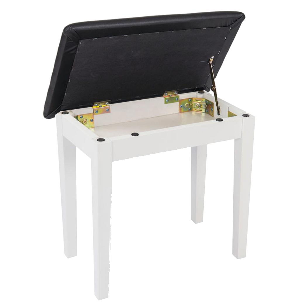 Banqueta rectangular blanco para piano. Una baqueta cómoda para relajarte y disfrutar tocando su piano. Contiene un cajon en el asiento para guardas las partituras y estar más ordenado y poder prepararte antes.