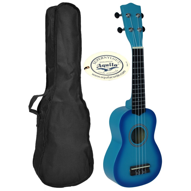 Ukelele soprano de color sombreado azul, de Lanai. Este modelo forma parte de una serie de ukeleles de colores muy bonitos con su clavija plateada. Este ukelele tiene un cuerpo de madera de tilo y su diapason y puente de granadillo, también incluyen unas cuerdas Aquila y una funda.