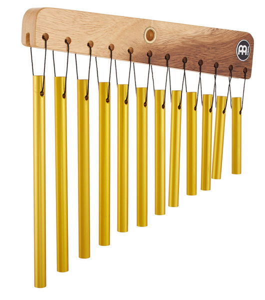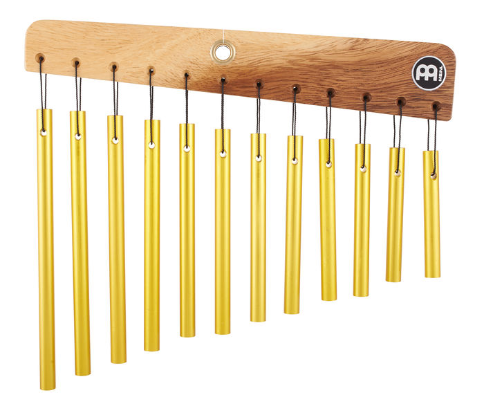 Cortina simple de barra CH12 de Meinl. Esta cortina está alineada en una sola linea, con 12 barras de aluminio acabadas en oro sujetas a un soporte de madera maciza, su sonido es muy fino así que es ideal para los acentos delicados.