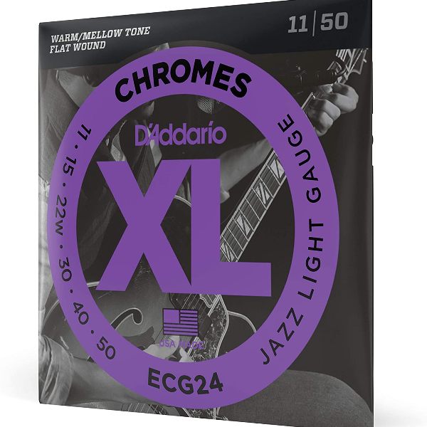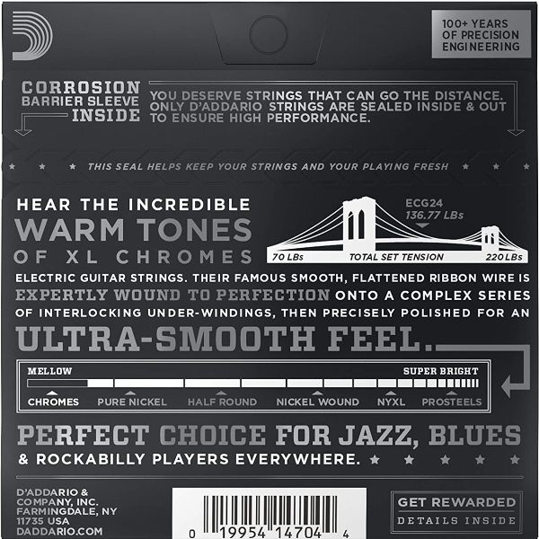 ECG24, el exitoso calibre de cuerdas de entorchado plano de D'Addario, ofrece un equilibrio de sensación de suavidad al tacto, tono cálido y melodioso y tensión óptima, ideal para jazz tradicional, el sonido vibrante del rockabilly, R&B y algunos estilos Las cuerdas de la serie Chromes de D'Addario están entorchadas con un cordón de acero inoxidable aplanado y pulido para lograr una superficie increíblemente suave. La serie Chromes ofrece tonos abundantes y un efecto amortiguado característico.