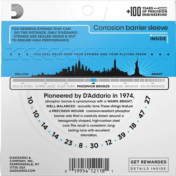 Ej38, el juego de 12 cuerdas más popular de d'addario, ofrece el equilibrio ideal de volumen, proyección y comodidad de uso; diseñadas para todas las marcas y modelos de guitarras acústicas de 12 cuerdas; el bronce fosforado fue introducido para la fabricación de cuerdas por d'addario en 1974 y se ha convertido en un sinónimo de calidez, nitidez y tono acústico bien equilibrado; las cuerdas de bronce fosforado de d'addario poseen un entorchado de precisión.