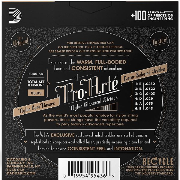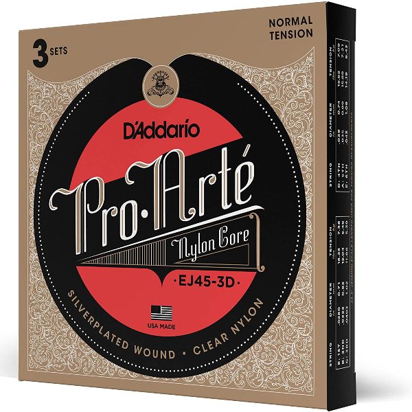Juego cuerdas para guitarra clasica conjunto de 3 juegos de cuerdas para guitarra española D'addario pro arté tensión normal. Las cuerdas pro-arte son nuestro líder de ventas en todo el mundo y las mejores cuerdas D'addario para guitarra española. Todas las cuerdas pro-arte son clasificadas por una máquina láser muy sofisticada controlada por ordenador que realiza medidas de diámetro/tensión y control de calidad, asegurando un gran sonido y unos agudos precisos en cada juego. Las cuerdas graves pro-arte son entorchadas usando un cobre chapado en plata sobre un núcleo multi-filamentado de nylon para obtener un tono cálido y con mayor proyección.