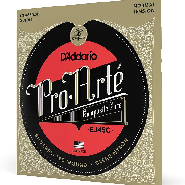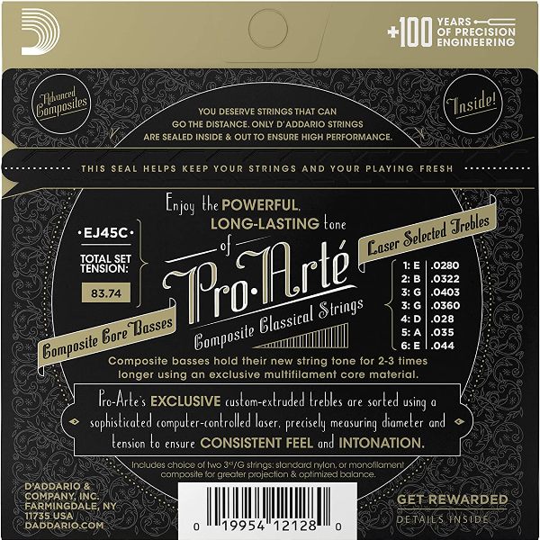 Ej45c de tensión normal es el juego de material compuesto más vendido de d'addario, elegido por su equilibrio de tono prominente pero cálido, sensación de comodidad al tacto y proyección dinámica; las cuerdas de material compuesto de pro-arte presentan un material exclusivo de multifilamentos trenzados en el núcleo, que proporciona un tono cálido y potente y dura entre 2 y 3 veces más que las cuerdas tradicionales para guitarra clásica.