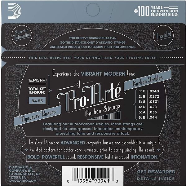 EJ45FF, tension normal, trae cuerdas agudas Pro-Arté Carbon y las graves en Dynacore para una entonación superior sin igual con la mezcla perfecta de tono, brillo y proyección. Experimenta el tono vibrante, contemporaneo y con gran proyección de las cuerdas Pro Arte Carbon de D’Addario. Diseñadas con las especificaciones más exigentes de nuestras cuerdas agudas de nylon Pro Arte.