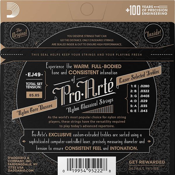 Ej49 de tensión media es el juego para guitarra clásica más vendido de d'addario con agudos de nailon negro, elegido por su equilibrio de tono robusto, sensación de comodidad al tacto y proyección dinámica; pro-arte, las cuerdas para guitarra clásica más populares del mundo conforman los juegos de cuerdas para guitarra clásica de calidad superior de d'addario.