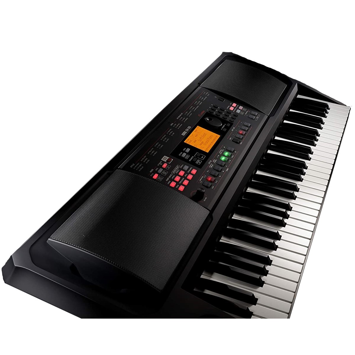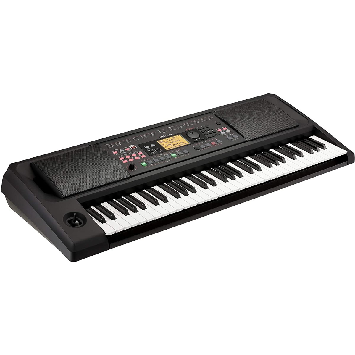 Teclado de 5 octavas EK-50 con teclas sensibles de Korg. Este modelo contiene 61 teclas con respuesta al tacto y una polifonía de 64 notas, con capacidad de grabación a tiempo real y escucharlo en un reproductor de canciones flexible, con una amplia variedad de ritmos, voces, efectos y controles. Estos se especifican en las característica.