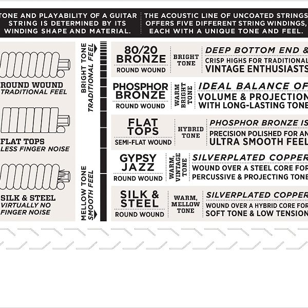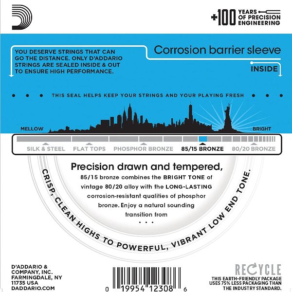 Las cuerdas ez910 poseen un calibre híbrido original de d'addario y resultan cómodas para los guitarristas que buscan la profundidad y la proyección de las cuerdas inferiores de calibre liviano, pero con una tensión ligeramente menor en las cuerdas altas el bronce 85/15 combina el brillo del bronce 80/20 con las características de mayor durabilidad del bronce fosforado; un cable de recubrimiento de bronce 85/15 se entorcha con precisión sobre un núcleo de acero de alto carbono con forma hexagonal y estira.
