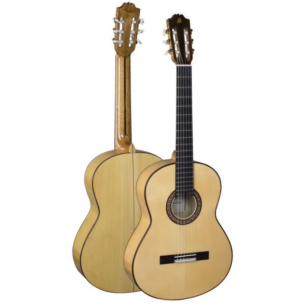La Admira 'F5' Flamenco está construida con tapa de Pino abeto alemán macizo y aros y fondo en ciprés español macizo en aros y fondo que dan a la guitarra un tono de flamenco estable y animado, complementado por un mástil de Caoba con el diapasón de Ébano.