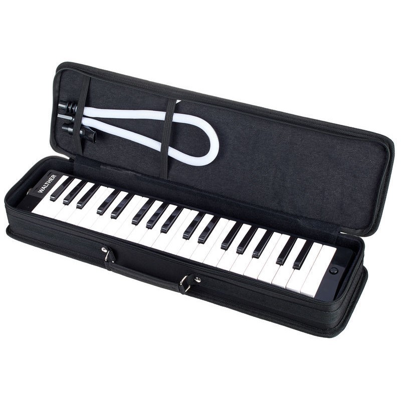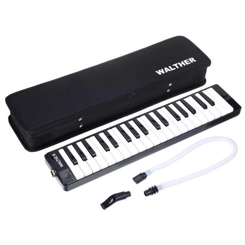Melódica con 37 teclas de Walther. La melódica es un instrumento de viento, parecido al acordeón pero soplando, contiene 37 teclas con disposición tonal, como un piano convencional, pero se caracteriza por su peso ligero y su tamaño tan compacto. Así es mucho más fácil de transportarlo y es muy divertido de tocar.