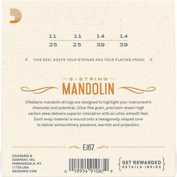 Juego de cuerdas para instrumento juego de cuerdas nickel para mandolina; ee aa dd gg (0,011, 0,014, 0,025, 0,039); las cuerdas d addario j67 para mandolina son ideales para mandolinas eléctricas o acústicas; las j67 tienen una cobertura de acero niquela do y son conocidas por su distintivo tono brillante y su excelente entonación.