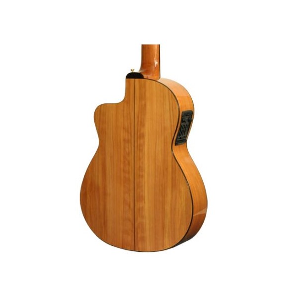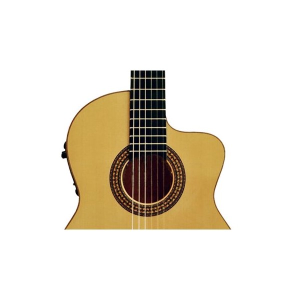 Guitarra flamenca con cutaway de José Torres. Dispone de una tapa maciza de abeto y aros y fondo de sicomoro, que gracias a eso le da su sonido peculiar. Su mástil de cedro con su diapasón de ébano le darán la sortura que necesitan las cuerdas.Tiene un puente de palosanto y su clavijero dorado le dan es toque elegante y contiene un previo Fishman Blend. Fabricada en España