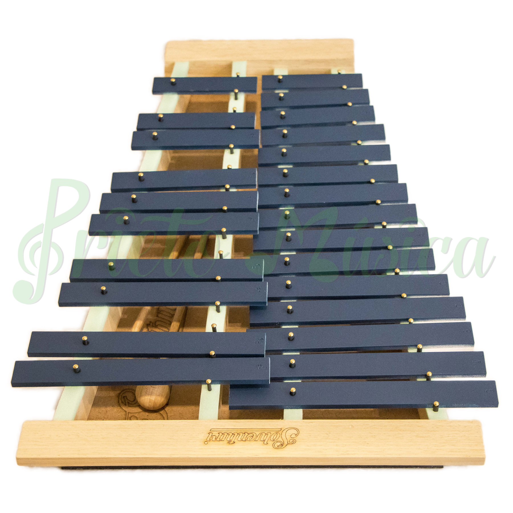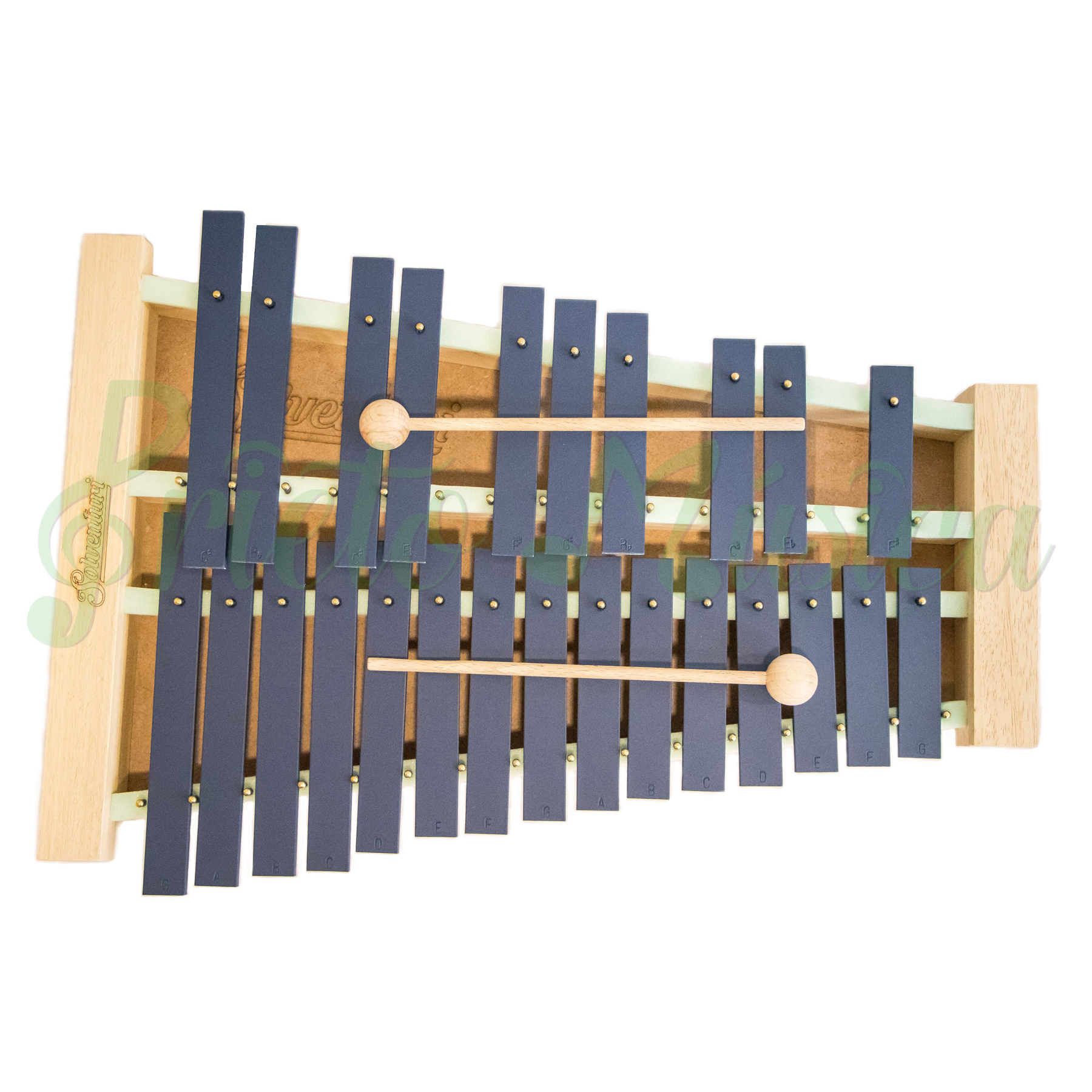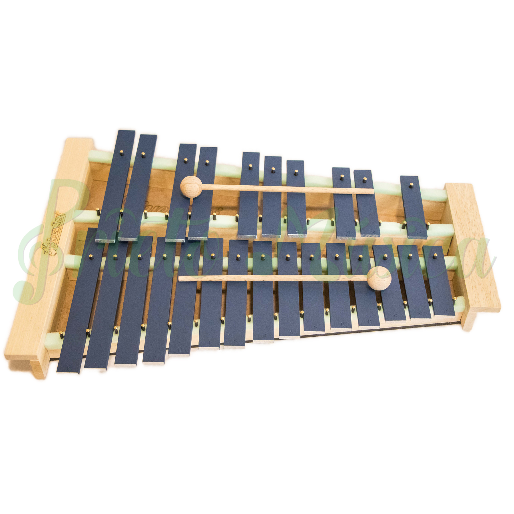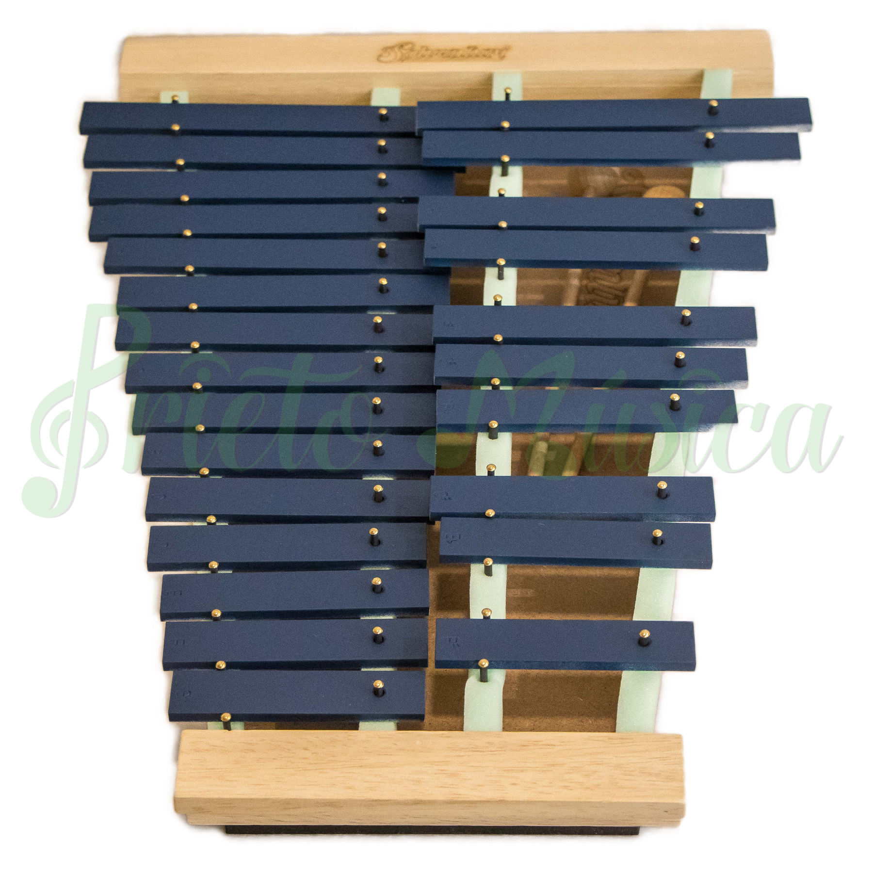 Éste modelo es el mas solicitado por orquestas y bandas ya que al ser cromático y de dos octavas permite interpretar todo tipo de música, pop, rock, musica experimental...., ademas es una buena herramienta para arreglistas durante la composicion y por quienes estan introduciendose en el mundo musical ya que permite interpretar melodias en un instrumento de facil ejecucion.Metalofono cromatico de 25 notas musicales con caja de madera