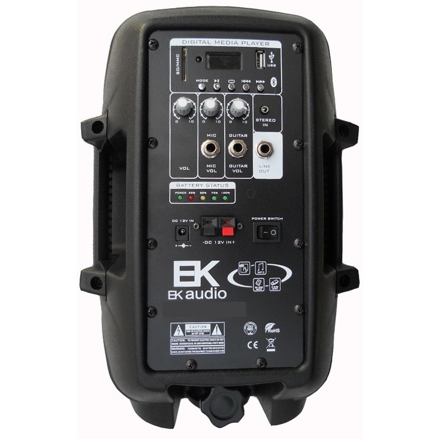 Columna Activa EK Audio Portatil 8 30W Batería Recargable, con él podrá reproducir audios MP·tanto por USB y SD Cards, como por bluetooth, para poder conectarlo inalámbricamente, incluye también un mando para poder controlarlo desde lejos. Aparte tiene una gran potencia de sonido RMS/Pico: 30 W / 120 W, con 2 canales para controlar el audio y Line de entrada y salida.
