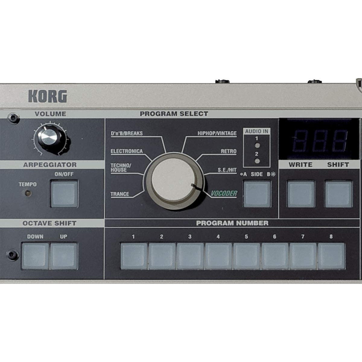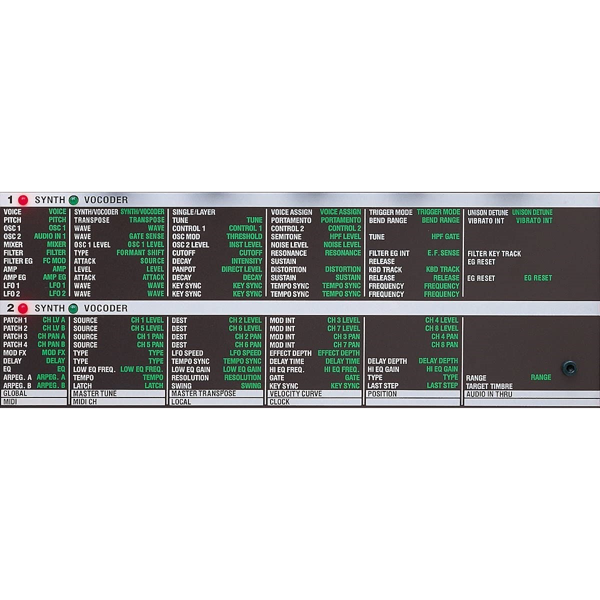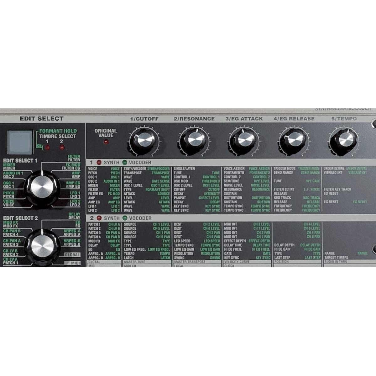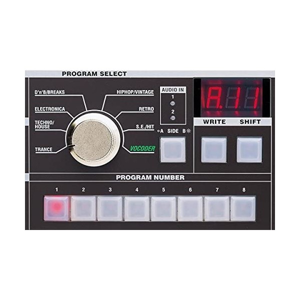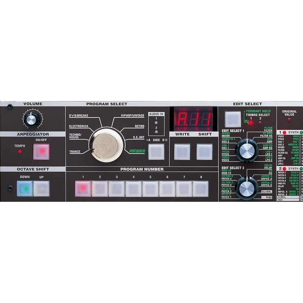 (PROGRAMA DE BOCODER) FUENTE DE SONIDO: 1 Oscilador + Generador de Ruido, EG×1, LFO×2, Vocoder de 8 Canales, El Nivel y Panorama de Cada Canal Puede ser Editado, Función Formant Shift