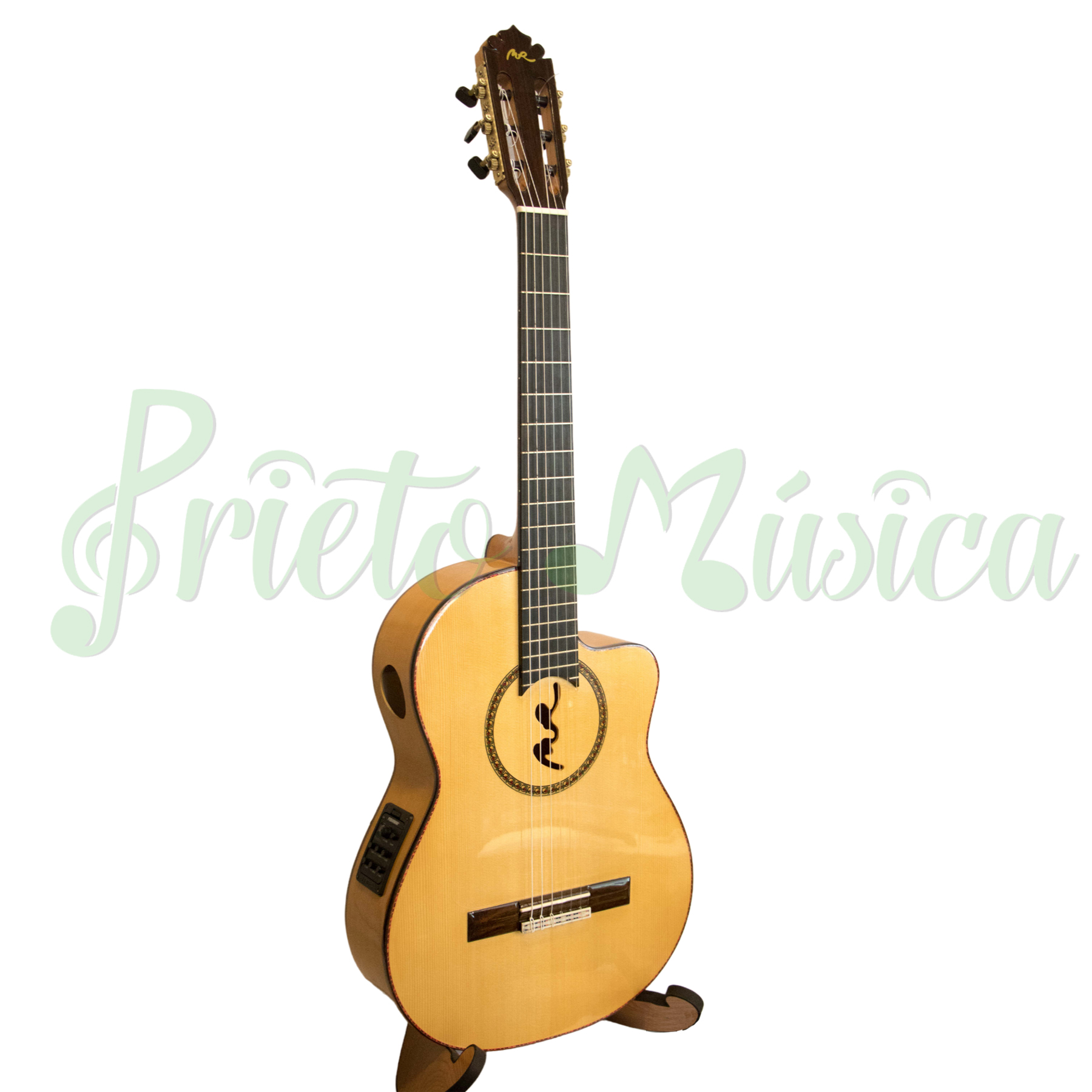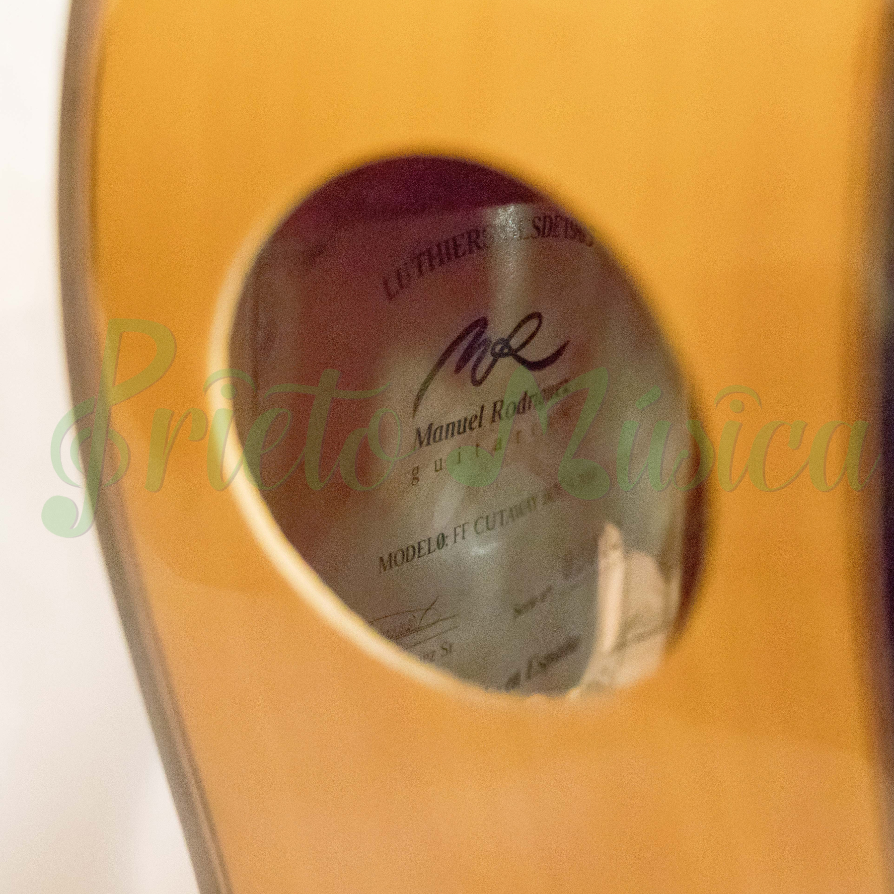 Guitarra flamenca Manuel Rodriguez con cutaway y previo fhisman pro blend prefix . Es una guitarra profesional con unas madera totalmente añejas,Las maderas cuentan con unos años de secado lo cual hace que la guitarra tenga mucho mejor sonido y mantenga una potencia bastenta grande.Contamos con la tapa de Pino Abeto y aros y fondo de Cipres, El diapason es de ebano con un refuerzo interno para que aguante bien la tension que genera. Cuenta con el puente de palosanto de la india una madera ejemplar