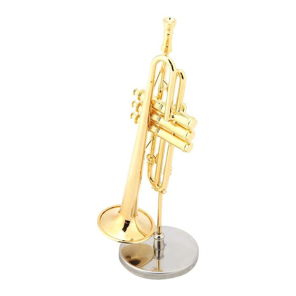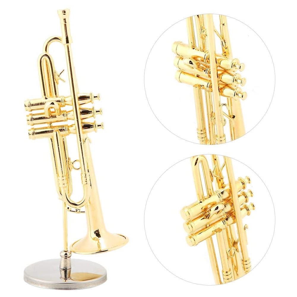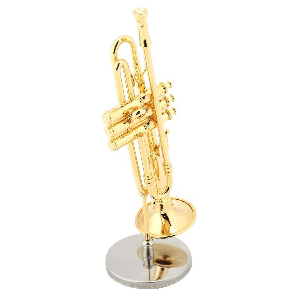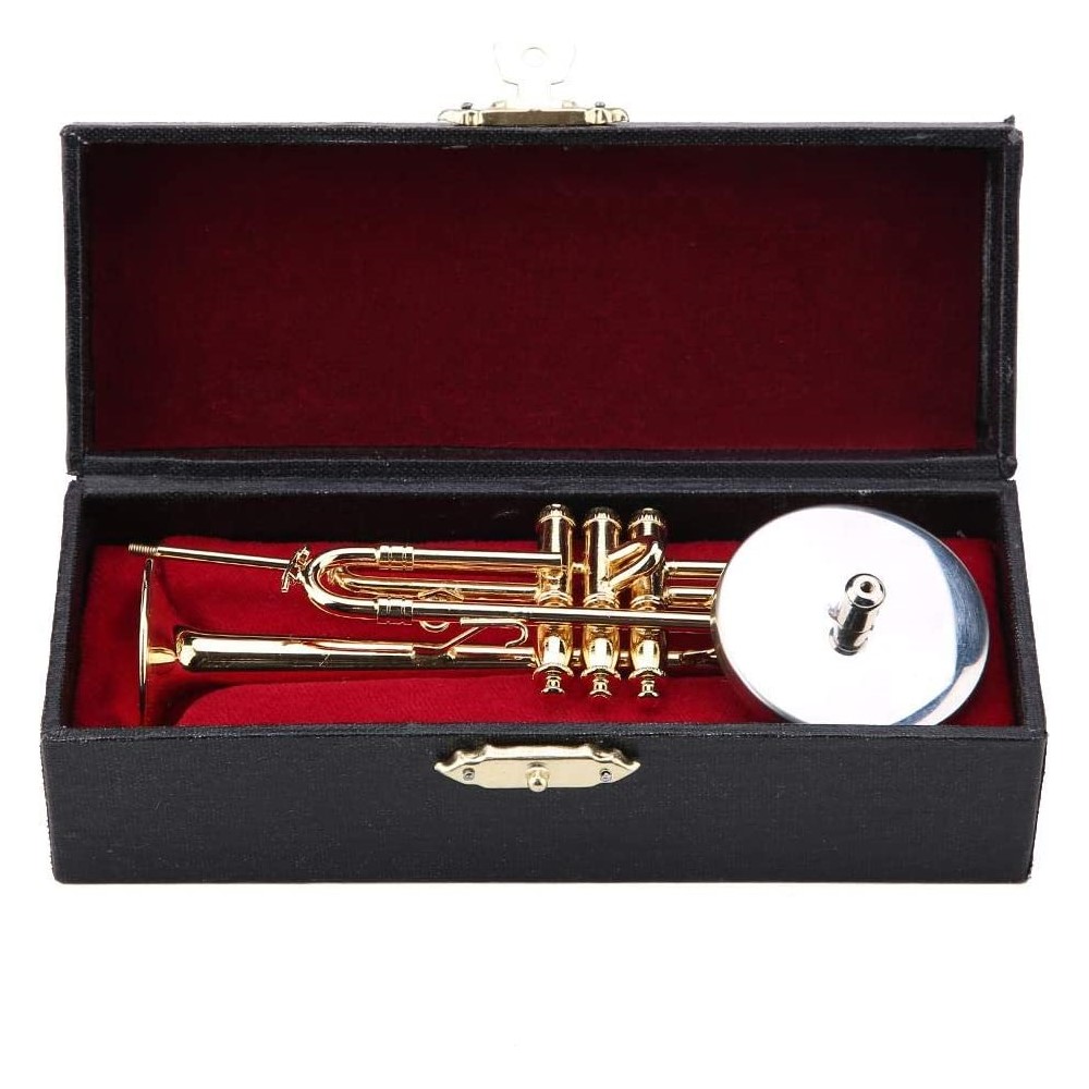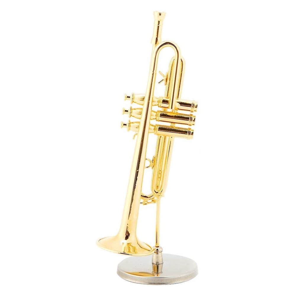 Miniatura de trompeta en metálico dorado decorativa. Con soporte metálico y estuche, es un buen regalo y una buena forma para dar un tono más musical a su hogar.