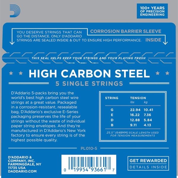 PL010-5 es un paquete de 5 cuerdas de acero liso calibre .010 para guitarra acústica o eléctrica. Perfecta como cuerda de repuesto o para crear juegos personalizados. Las cuerdas de acero liso para guitarra de D'Addario son aclamadas mundialmente por su tono exquisito y duradero.
