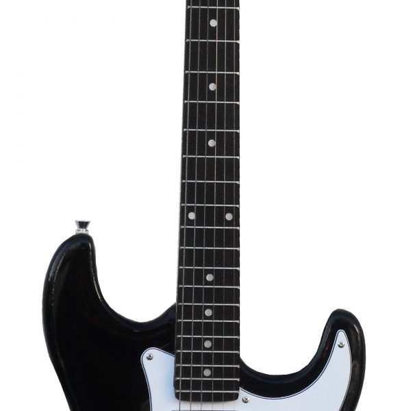 Esta guitarra eléctrica de Daytona ST-309 tiene una forma de Stratocaster, y tiene una gran fiabilidad por su taba bastante resistente de madera maciza que junto con diapasón de palosanto nos dara un sonido mas redondo y contundente, . En su ambito electrico, podemos decir que está electrificada con cutaway con una configuración de 3 pastillas simples pero efectivas, y por ultimo tiene un acabado de lo más elegante en negro con un alto brillo y motivos en blanco, para que despierte la curiosidad de los espectadores.