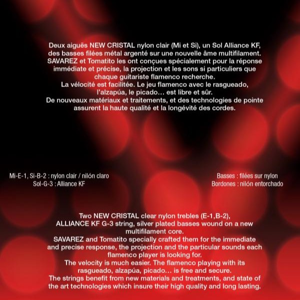 Juego de cuerdas Tomatito T50J de Savarez. Cuerdas para guitarra clásica/flamenca con tensión Alta, contiene dos agudos de nailon transparente de new cristal (1.Mi-2.Si), y la 3ª cuerda es ALLIANCE. Los bajos están entorchados en plata en un nuevo núcleo multifilamento. En general estas cuerdas tiene un manejo muy rapido y fácil, para la cómodida y la seguridad del músico que las toque.