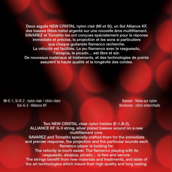 Juego de cuerdas Tomatito T50J de Savarez. Cuerdas para guitarra clásica/flamenca con tensión media, contiene dos agudos de nailon transparente de new cristal (1.Mi-2.Si), y la 3ª cuerda es ALLIANCE. Los bajos están entorchados en plata en un nuevo núcleo multifilamento. En general estas cuerdas tiene un manejo muy rapido y fácil, para la cómodida y la seguridad del músico que las toque.