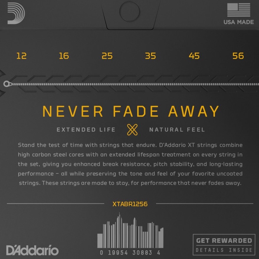 Cuerdas xt 12-56 de D´ddaddario son mas duraderas que duran un 42 por ciento más que otras gracias a su recubrimiento microscópúa Diseñado para mantener tu tuningperfecto tono El timbre completo y claro como el cristal le da a su guitarra acústica un sonido perfecto Cuerdas que no tienes que cambiar todo el tiempo - y son tan buenas que no querrás hacerlo
