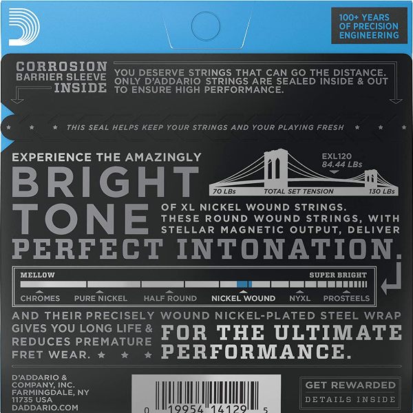 EXL120, uno de los juegos más vendidos de D'Addario, ofrece una gran flexibilidad y tono penetrante. Una opción estándar para muchas guitarras eléctricas. Las cuerdas para guitarra eléctrica entorchadas en níquel XL, las más populares de D'Addario, poseen un entorchado de precisión con acero niquelado sobre una cuerda de acero de alto carbono, con forma hexagonal y estirada cuidadosamente.