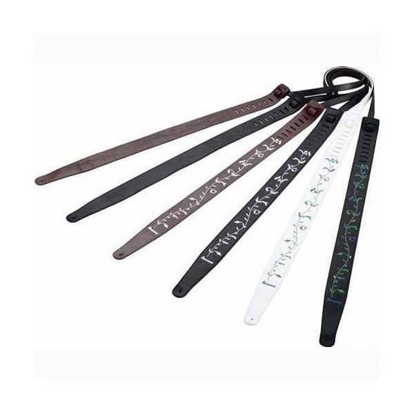 Correa para sujetar su guitarra con total comodidad en los hombros. Tiene un curioso y bonito diseño de hojas azul y verdes en un fondo blanco negro. Con un tejido de cuero con buena durabilidad y una sujeción segura y fiable.