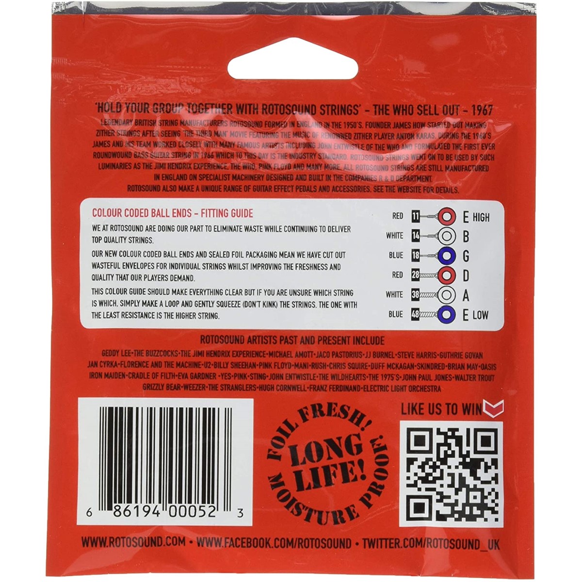 Juego de cuerdas de guitarra eléctrica R11 de Rotosound. Estas cuerdas de níquel se fabrican con tolerancias precisas utilizando solo los mejores materiales. Usado y respaldado por artistas famosos en todo el mundo. Estos conjuntos le darán un brillo excepcional y un tono soberbio. Hecho a mano de la mejor calidad en Inglaterra con un 1er.