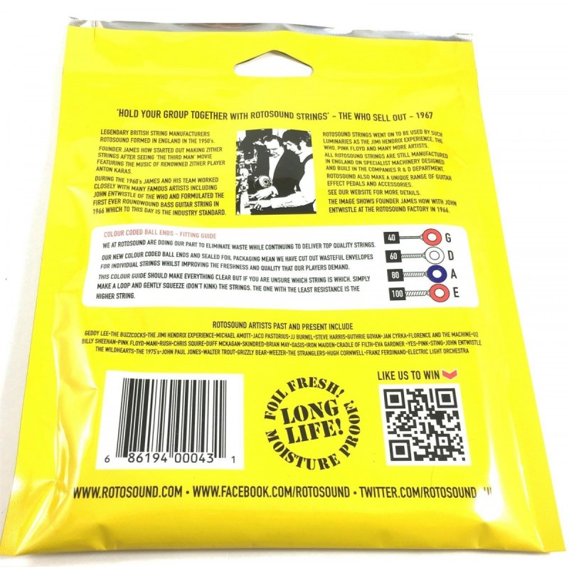 Juego de cuerdas de bajo eléctrica RB40 de Rotosound. Estas cuerdas de níquel se fabrican con tolerancias precisas utilizando solo los mejores materiales. Usado y respaldado por artistas famosos en todo el mundo. Estos conjuntos le darán un brillo excepcional y un tono soberbio. Hecho a mano de la mejor calidad en Inglaterra con un 1er. La cuerda mide 37 pulgadas desde el extremo de la bola hasta el comienzo de la cubierta de seda. Nótese bien, y tengan en cuenta que estas son cadenas de escala larga.