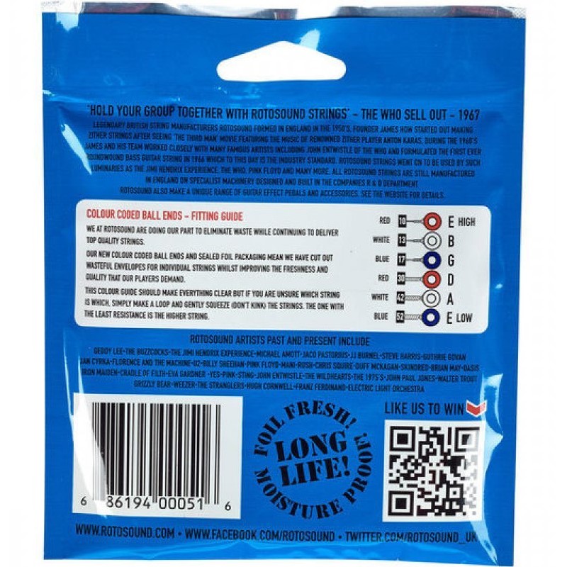 Juego de cuerdas de guitarra eléctrica RH10 de Rotosound. Estas cuerdas de níquel se fabrican con tolerancias precisas utilizando solo los mejores materiales. Usado y respaldado por artistas famosos en todo el mundo. Estos conjuntos le darán un brillo excepcional y un tono soberbio. Hecho a mano de la mejor calidad en Inglaterra con un 1er. La cuerda mide 37 pulgadas desde el extremo de la bola hasta el comienzo de la cubierta de seda. nótese bien, y tengan en cuenta que estas son cadenas de escala larga