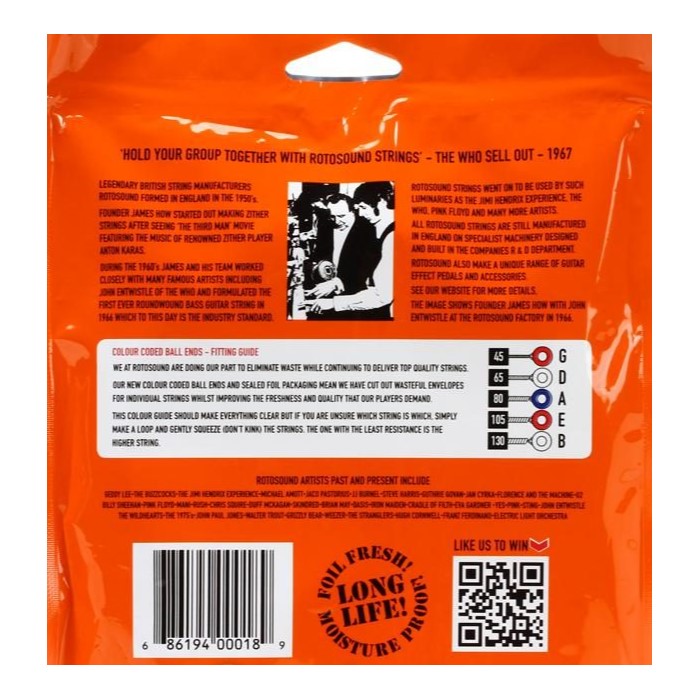 Juego de cuerdas de bajo RS665LD de Rotosound. Estas cuerdas de acero inoxidable se fabrican con tolerancias precisas utilizando solo los mejores materiales. La cuerda mide 37 pulgadas desde el extremo de la bola hasta el comienzo de la cubierta de seda. Nótese bien, y tengan en cuenta que estas cadenas son de escala larga.